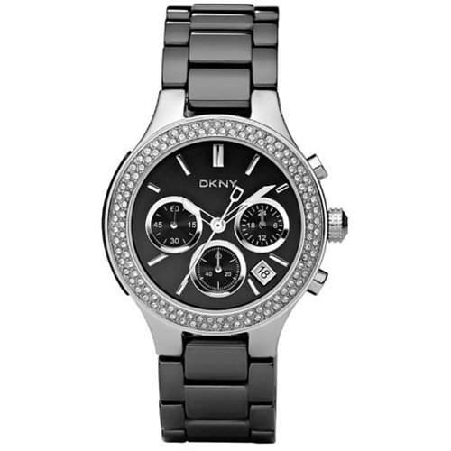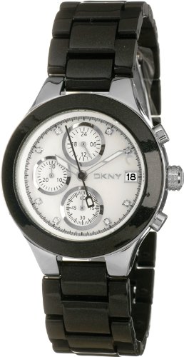 Casual watch, Japanese quartz movement, Chronograph featuring 24-hour, 30-minute and chronograph seconds subdials, Polished silver-tone sword hands with luminous accents and black sweep seconds, Applied crystal hour markers, Black Arabic numbers and indices mark subdials, Black indices form surrounding minute track, Analog date aperture at three o'clock, White mother-of-pearl dial with polished silver-tone logo applique, Glossy black plastic bracelet with adjustable links and push-button-clasp, Glossy black plastic bezel, Polished silver-tone stainless steel round case, Textured steel crown, Polished steel selector buttons, Stainless steel screw-down caseback, Mineral crystal, 50 meters/165 feet water resistant